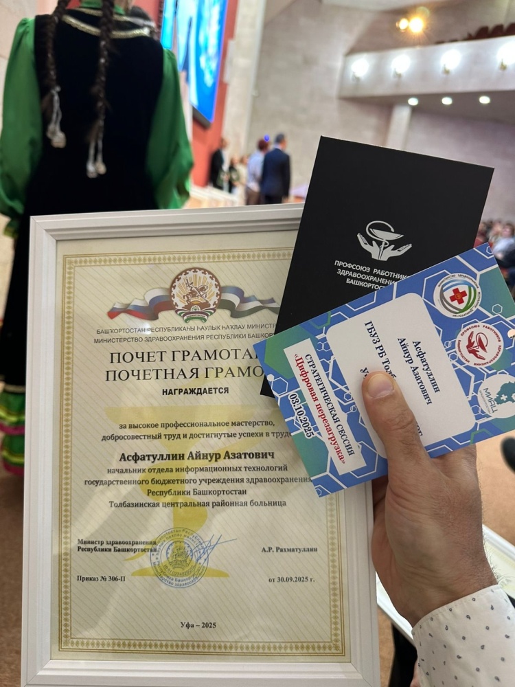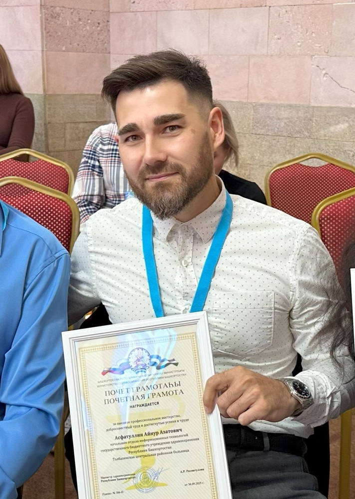 Наш коллега, начальник отдела информационных технологий Асфатуллин А. А., получил почетную грамоту от министра здравоохранения Рахматуллина А. Р. Поздравляем Айнура Азатовича и желаем успехов в работе! Ведь от работы информационных технологий зависит эффективность всей больницы.