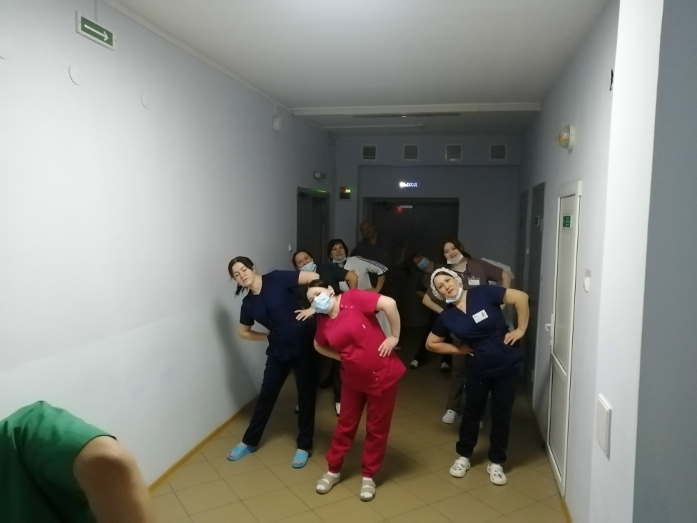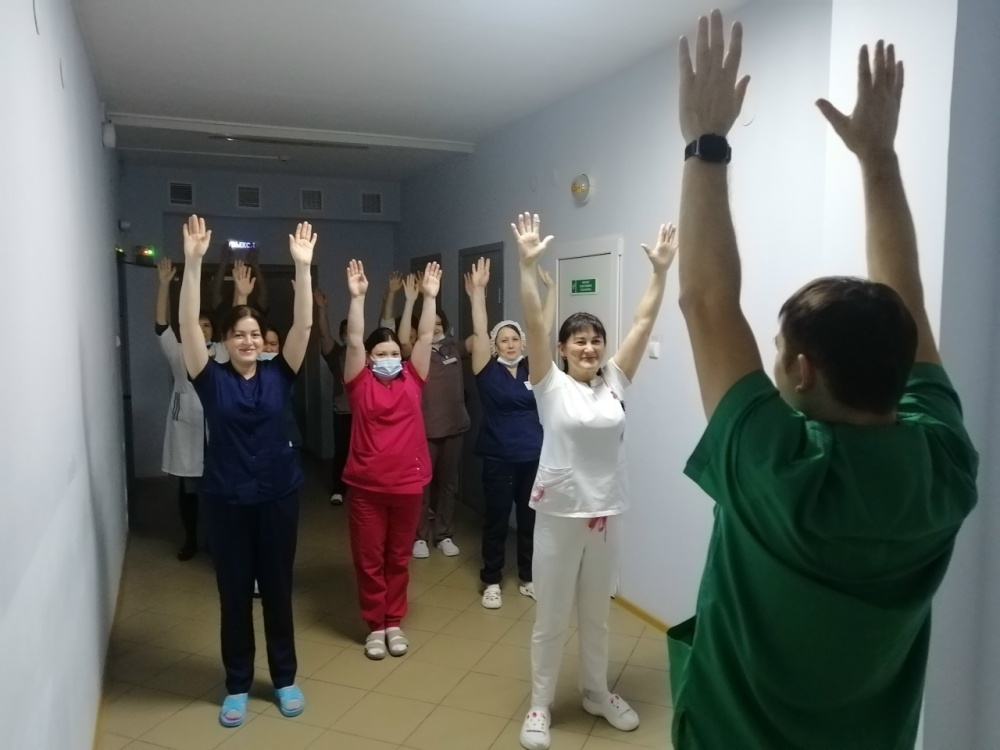 Сотрудники Толбазинской центральной районной больницы в хирургическом корпусе начинают утро активно — с зарядки!