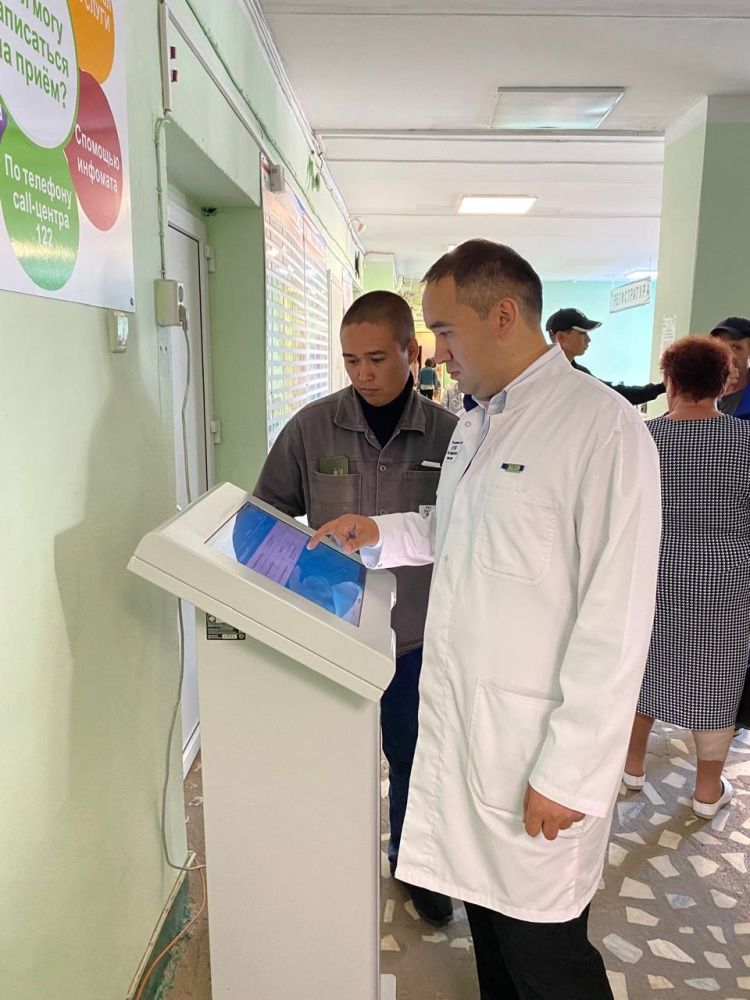 Обход начался с регистратуры, главным врачом было обращено внимание на способы записи пациентов к врачу, проверена работа инфомата. Перед доврачебным кабинетом Азат Замирович побеседовал с пациентами, находящимися в очереди, поинтересовался проблемами по записи к врачам.