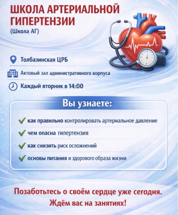 Приглашаем вас в Школу артериальной гипертензии, чтобы научиться контролировать давление и сохранить здоровье сердцаКаждый вторник в 14:00 в конференц зале Толбазинской ЦРБ (административный корпус)