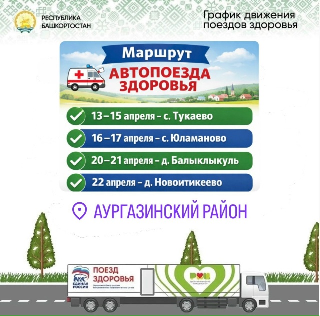 «Автопоезд здоровья-2026»В период с 13 по 22 апреля 2026 года в Аургазинском районе состоится масштабная медицинская акция «Здоровая республика — здоровый регион».